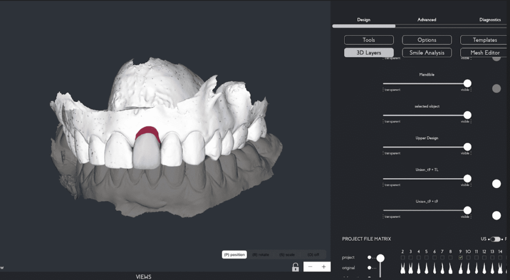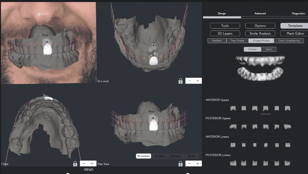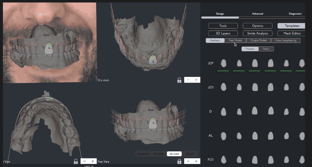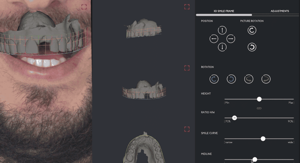 Note: To ensure the quality of the design, different views of the 3D project are accessible, allowing the smile designer to move the tooth and have a visual reference of its position from various angles and the buccal volume of the anterior teeth.