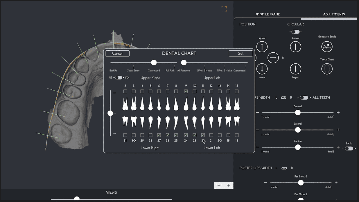 (Fig.3 After pre-setting the proportions, Dental Chart lets you select from a single unit to the entire arch to automatically create the digital wax-up.